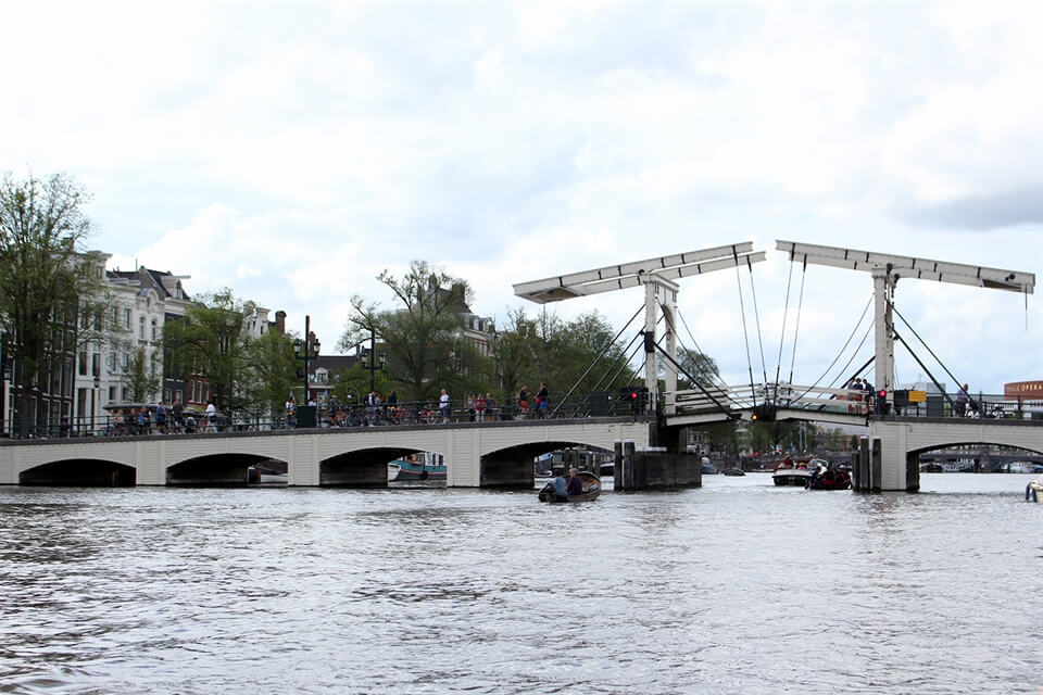 From one side of the bridge you'll see a small row of houses line up beside canal's waters just next to where the canal narrows under a small bridge, and on the other side you'll find a classic Amsterdam canal scene featuring a three-arch bridge with no doubt plenty of people and bikes battling their way across.
