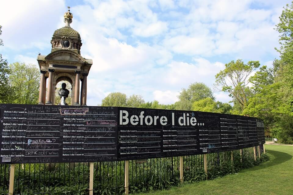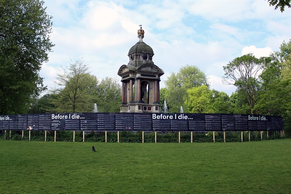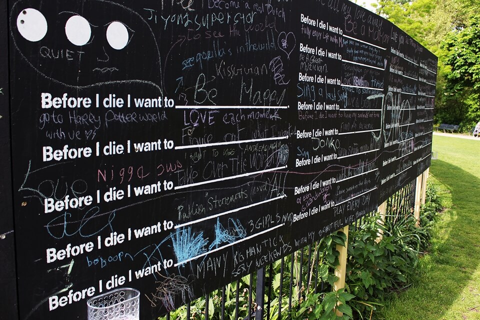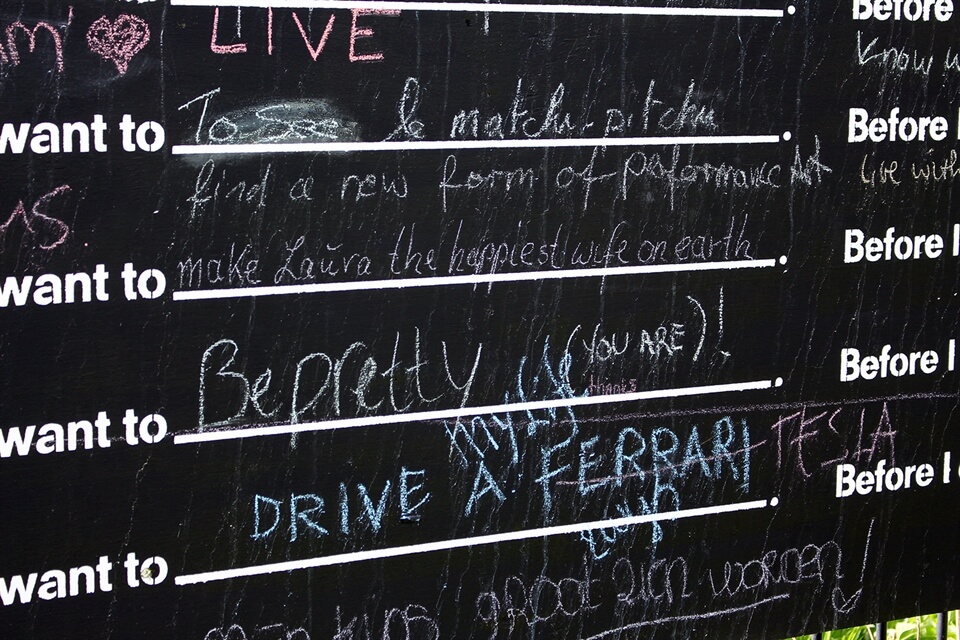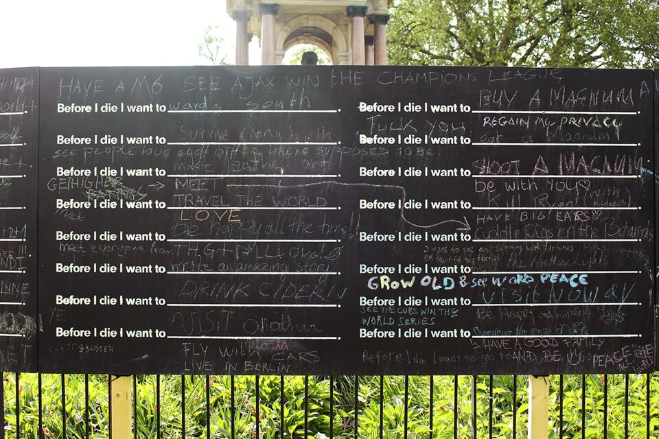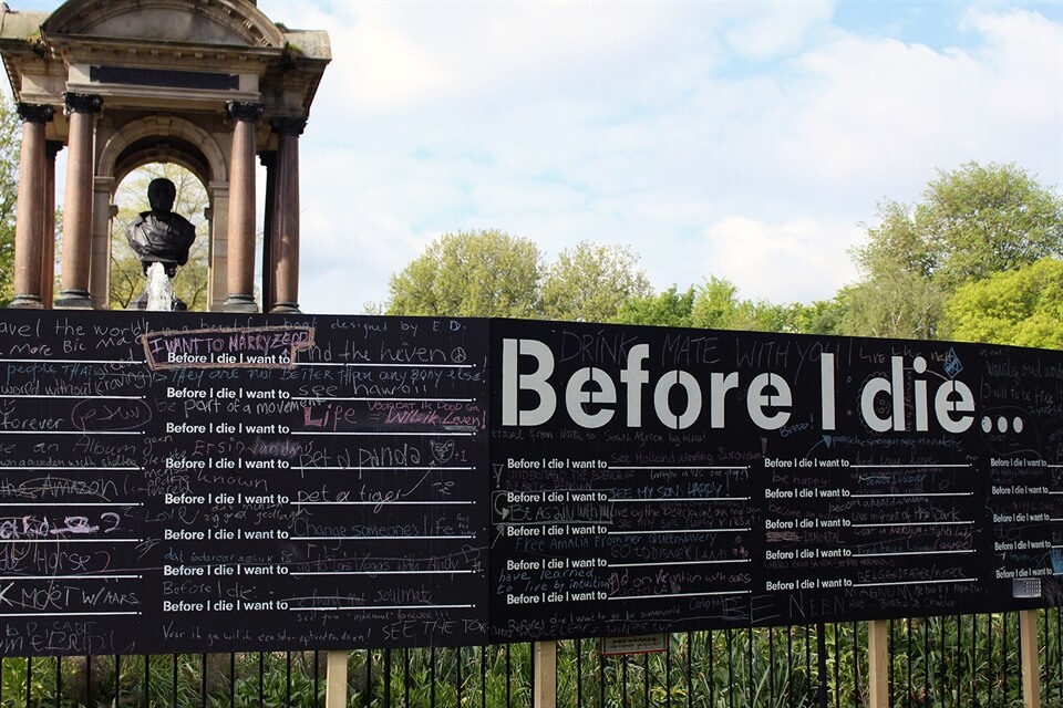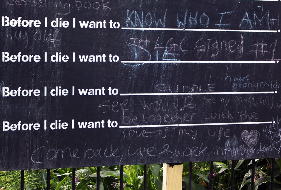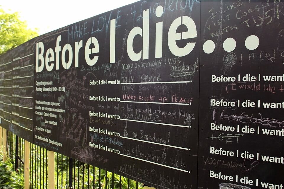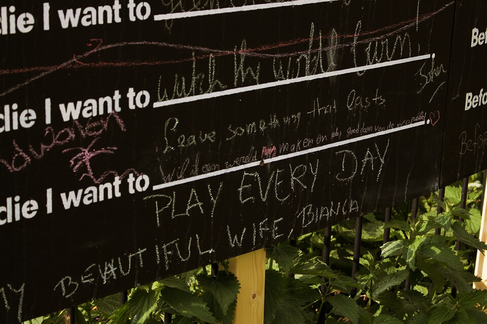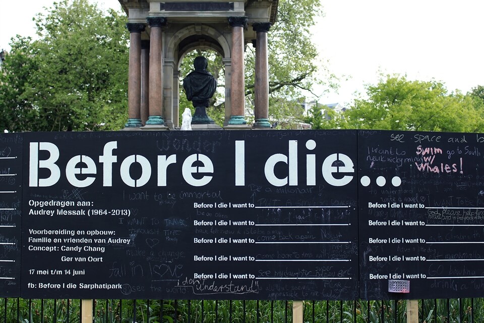 Here is more information about the original Before I die... project started by Candy Chang in a storm-ravished abandoned house in New Orleans and here's information about the Amsterdam project which is in Sarphatipark until 17th June 2015 and general information about the project in communities around the world.