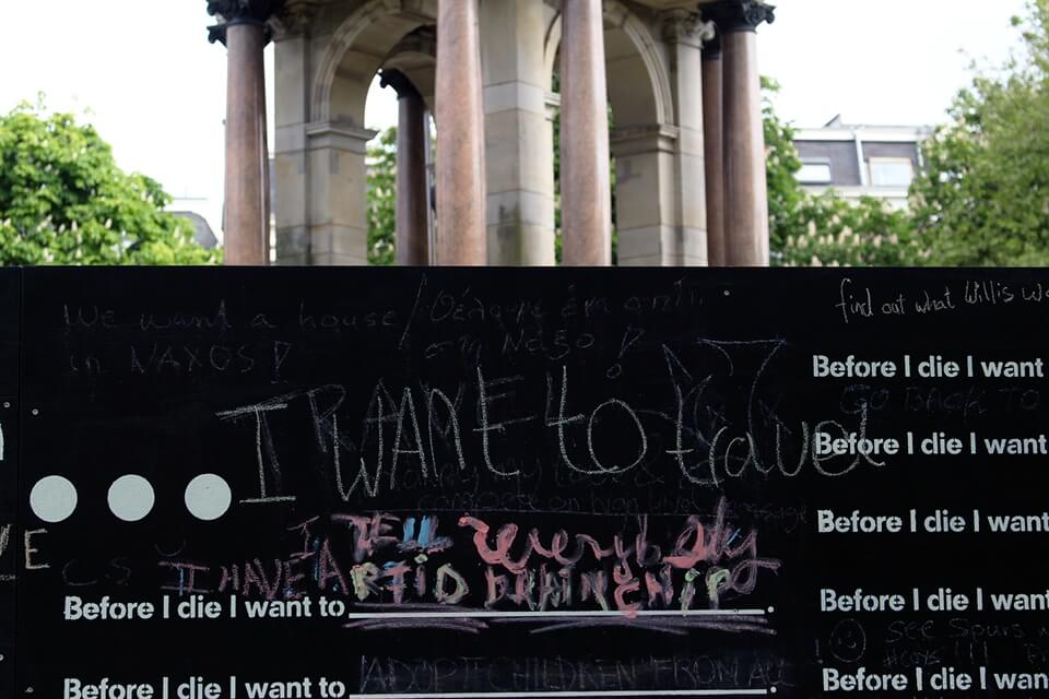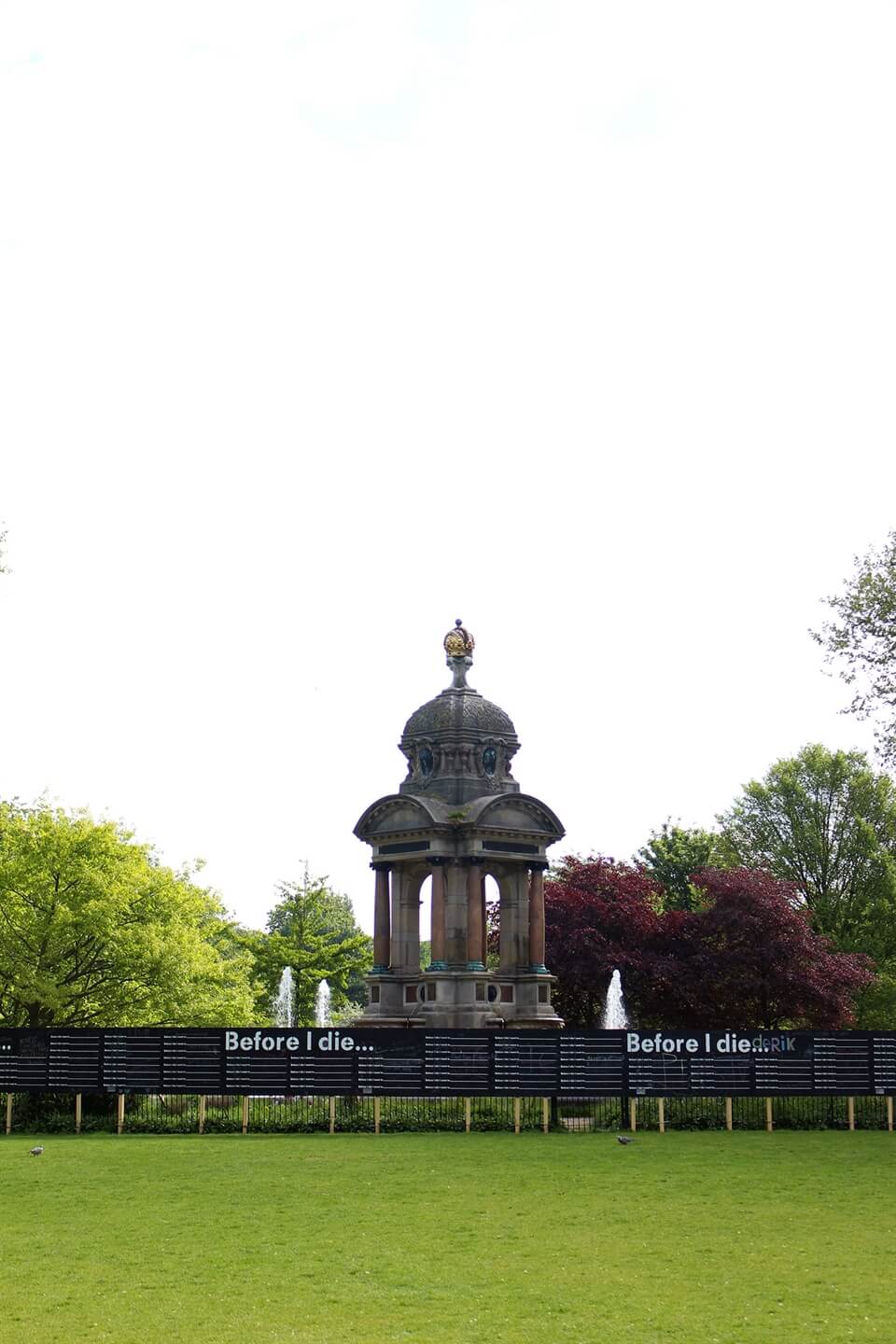 The reason I was asking myself this question was because a ring of Before I die... boards had popped up in my local park, Sarphatipark, and a few mornings after we watched them construct it I walked down there and read the answers other people had left. It was an educational experience. From the honest ("Before I die I want to have a threesome with 2 guys") to the hilarious ("Before I die I want to see Tottenham get relegated"), the philisophical ("Before I die I want to know who I am") to the (rather understatedly) materialistic ("Before I die I want to drive a Ferrari"), the romantic ("Before I die I want to kiss Marolijn") to the generous ("Before I die I want to help the poor & sick", written in child's handwriting I want to add), and a lot of beautiful, bonkers and brilliant statements in between, I felt that the fifteen minutes I spent wondering around the boards were more educational about the human race than reading a book on the subject.