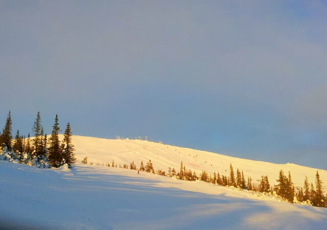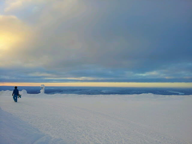 Like Levi, Ylläs' skiable areas hug the side of a "mountain". The inverted commas are for all those who are used to Alpine mountains, as Ylläs' peak is only 719 metres. I say "only" as we have learnt in the last 48 hours that this is enough height to provide for some really great long runs and the shape of Ylläs' seven fells allows for some beautiful wide pistes facing the bright, barely rising sun. It's a horizon against which I've never snowboarded towards before.