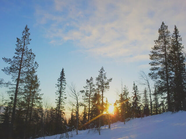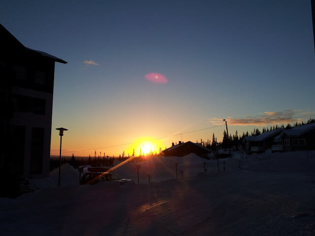 We left Levi on Monday afternoon and as we drove the short distance between to Ylläs the sun was beginning to set. This is a dramatic and drawn out experience up here in Finnish Lapland and certainly adds to the magic of the landscape that I've nearly grown used to, though I definitely shouldn't. Our taxi followed a road purposefully carved through a snowy forest and NewMan and I fell into a comfortable silence as we processed the leaving of one place and the arrival at another.