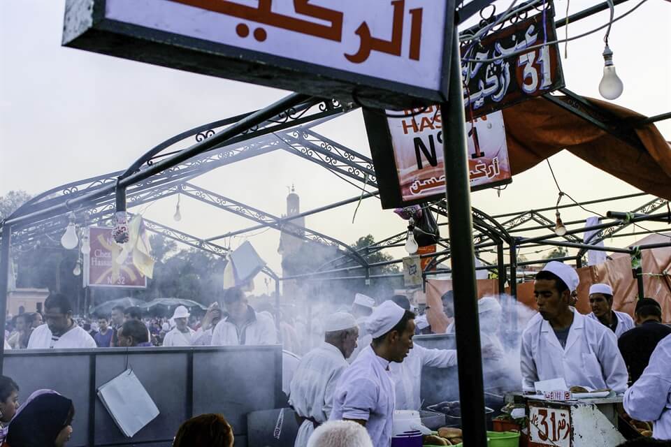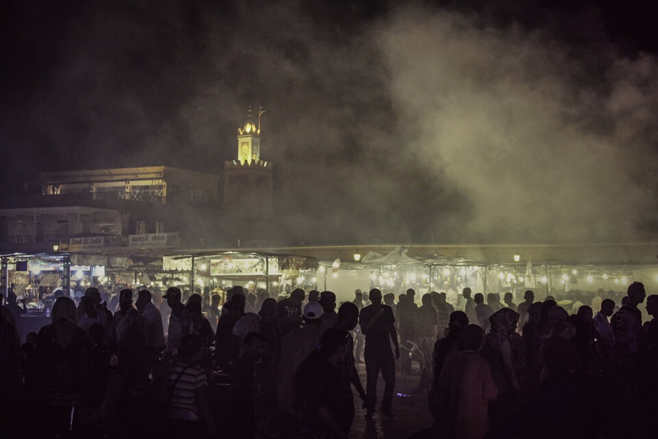 Back in the medina, the Jemaa el Fna was transformed. Food stalls had popped up everywhere, covering a part of the square in neat, numbered rows. It was dinner time and I followed a small cloud of smoke emerging from one stall: number 31. No menu, no variety, all I had was a choice of how many merguez sausages I wanted and whether I liked mint tea or coke with my meal. I sat between a father and his son on one side and a whole family on the other. The little boy ate his sausages with gusto though his real highlight seemed to be his very own bottle of coke. I was also digging in quickly as there was a line of people waiting for a seat behind me. I finished and walked away. With great ease I begin drifting through the crowds on the square. Whenever there was a circle of people, you knew something exciting was happening in its middle. Acrobats, dancers, snake charmers, and those storytellers were at work. I tried my best to ignore the monkeys who were wearing a diaper and a leash, I felt nothing but pity for them.