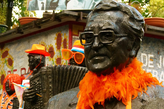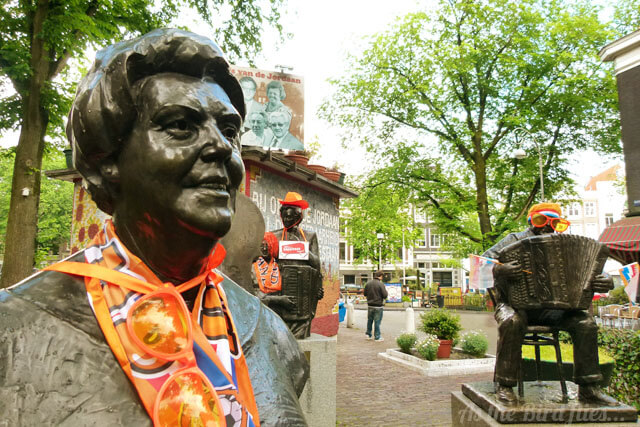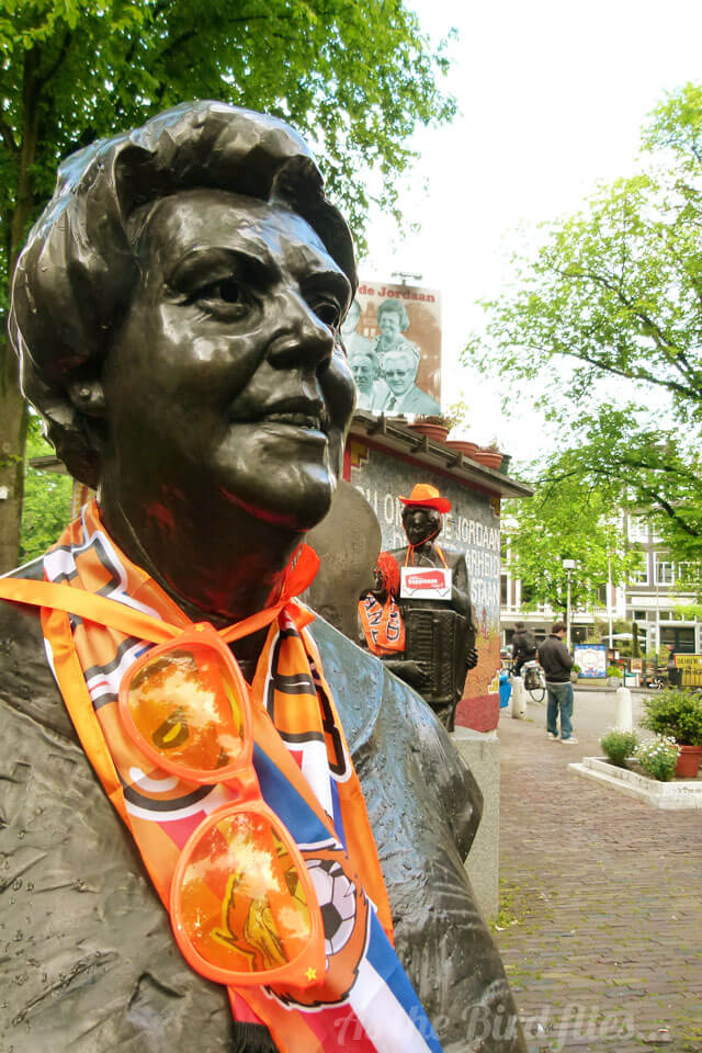 Just like on Queen's Day in Amsterdam bunting is stretched three or more storeys up across streets lined with terraced houses, Dutch flags have been painted on shop windows, orange shirts were worn in abundance on Saturday (the day they beat Northern Ireland 6-0 in a friendly game) and yesterday as we cycled around town we saw someone had given Johnny Jordaan and friends an orange makeover.