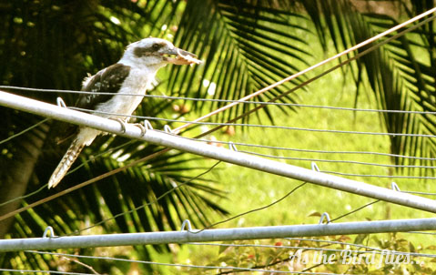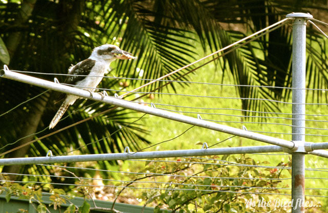 ... or rather Kookaburra sits on the washing line in a suburban back yard of Coff's Harbour.I spotted this Laughing Kookaburra in the neighbours garden while we were staying with NewMan's Mum in Coff's Harbour and I quickly snapped a photo. Kookaburras are hardly unusual or uncommon birds in Australia but NewMan tells me in his dulcet Aussie tones "you don't see them everyday, love" so that was reason enough to take a photo.