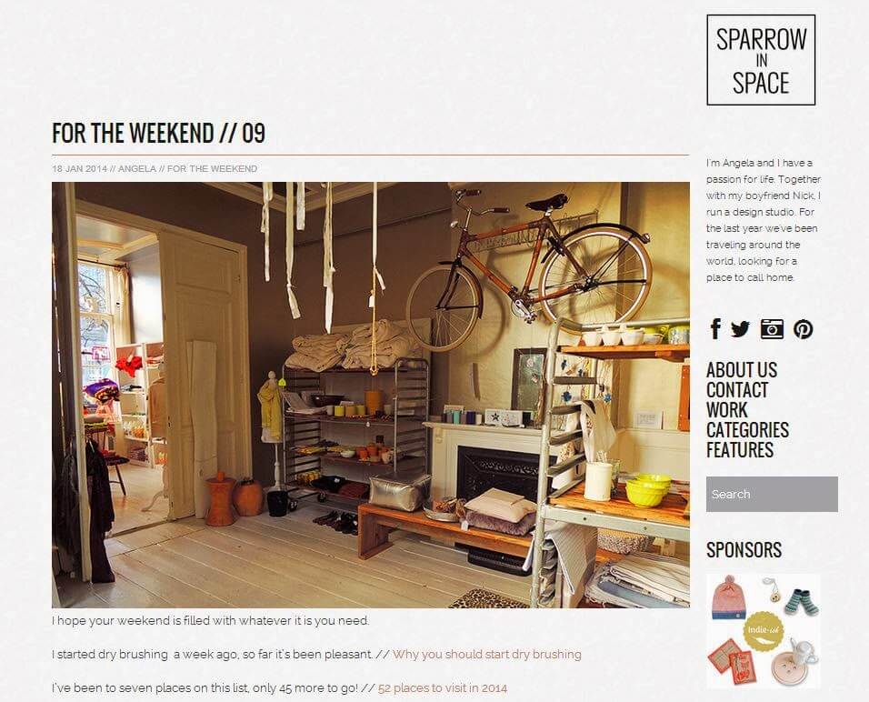 Sparrow in Space Thanks to Monica of The Travel Hack (another fantastic read for pure wanderlust and practical travel advice) I found this pretty blog that once documented the young Dutch couples' travels, but now follows them as they settle back into "real life" in Haarlem. I love the photography and the effortless writing. A soothing space for me to seek escape and inspiration from just down the road!