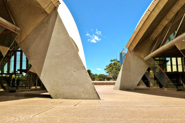 Inside and out the Sydney Opera House the main design features are either lines or curves and these compliment each other both gracefully and awkwardly.