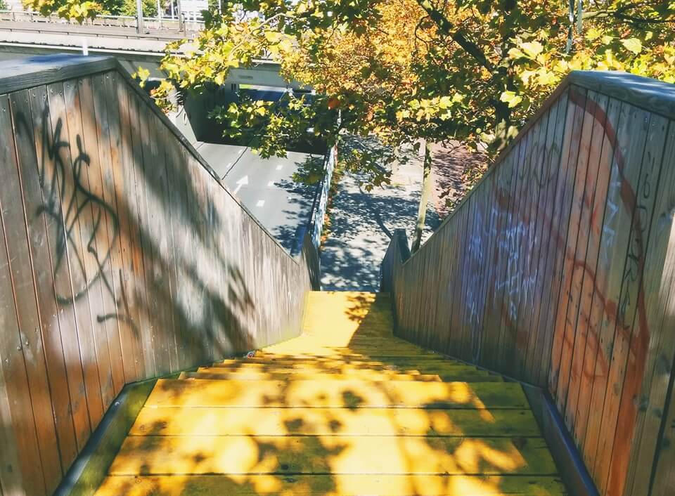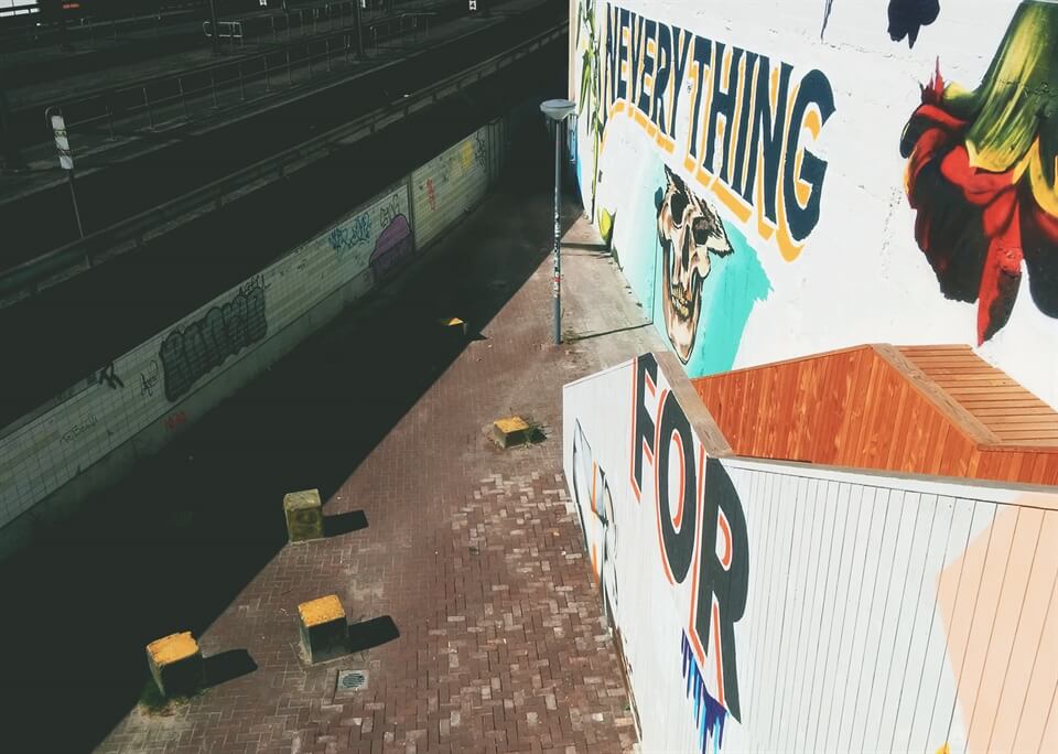I spent a sunny afternoon wandering along the Luchtsingel, going backwards and forwards, stopping to read the names, then walking on and staring out at the buildings crowding my view. I heard the cars thunder under the bridge beneath me and I heard the screech of trains coming into the station on the other side. There was lots of noise, lots of activity, lots of things to see... and yet I still enjoyed many moments of calm. I was also mostly alone which I found surprising, and very enjoyable, it felt like I had stumbled upon a secret walkway that led somewhere special.. And it kind of did as I found a collection of cute shops and some cool street art at the other end... but really the fun was in the walking along the yellow wooden path (not brick road), the fun was in the journey, and it's not often you can say that and really mean it.