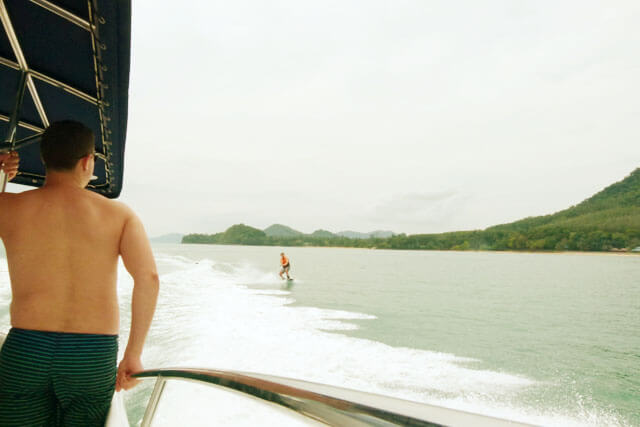 On Sunday we hired a speedboat for the day and toured the beautiful corner of the Andaman Sea that washes up into Phang Nga Bay. We snorkelled, wakeboarded, sunbathed and had lunch in one of our favourite places in Thailand - at La Sala restaurant at Koyao Bay Pavillions on Koh Yao Noi. We also saw "James Bond Islands" - Koh Tapu - and navigated into the mangroves. Later we glided past Koh Hong and the island of Koh Panyi, an impressive village built on stilts around a huge lump of limestone.