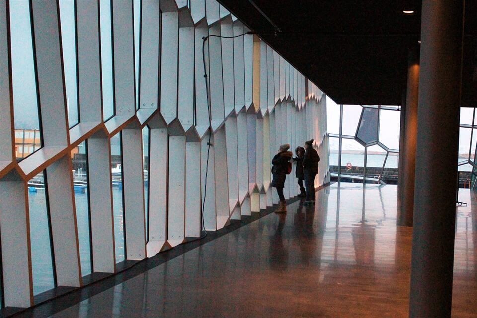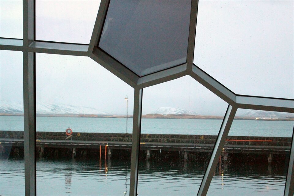 Wanting to walk our breakfast off a bit we set off to find Harpa, the one place I regretted missing on my first trip here back in June 2013 (I apologise for small photos in that post, I haven't been able to resize photos in old posts unfortunately). It was around 10.30 in the morning when we noticed a change in the sky and the tones of everything turn from a dull black and white to a slow sepia. And then the light finally came on, just as we were approaching the striking site of the music hall, which looked much more at home next to the contstruction work that was going on than the white-peaks of the mountains behind it across an icey blue stretch of water. I say the light came on, what I really mean is that a dodgy bulb from the 1970s on its last legs was switched on and I spent the rest of the day having to remind myself it wasn't going to get any brighter...