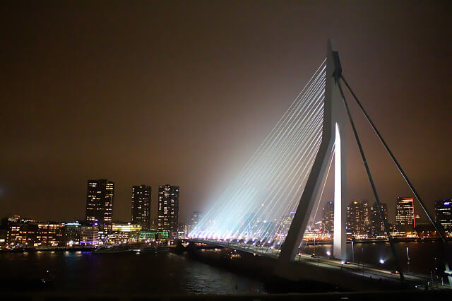 But back to Nhow (geddit!?). I'm happy to say that the inside has as much of the WOW factor as the outside, with a modern design throughout. From the ground floor lobby you have to take a lift (a loooooong way) up to the floors where the rooms are and even further up you'll find the bar and restaurant. All of which offer incredible views, including a roof terrace next to the bar where you can sit outside and gaze out over the Erasmusbrug all lit up at night.