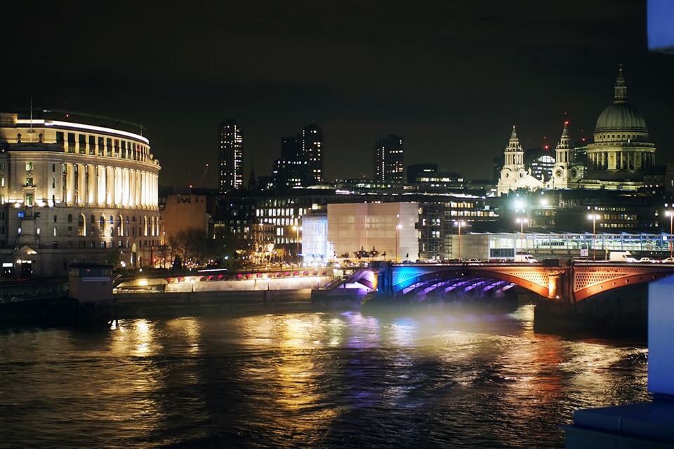 Of course, I've stayed in London hotels before, but I've never stayed in a hotel on the Thames. As in, you could actually see the River Thames from our room. And St Pauls. And Blackfriars Bridge. And HMS President, now all covered in graffiti-esque artwork. I could have spent hours gazing out of our window but after four busy days of travel, a long afternoon of conversations with old friends, and a nearly four-month old baby stirring in my arms from his nap, the HUGE (yes, capital letters required) bed looked just as attractive. I placed Baby Bird in the middle of it, got out some of his toys and he, his dad and I all chilled out on that GIGANTIC bed for a few hours as we watched the lights of London come on from out of the window.