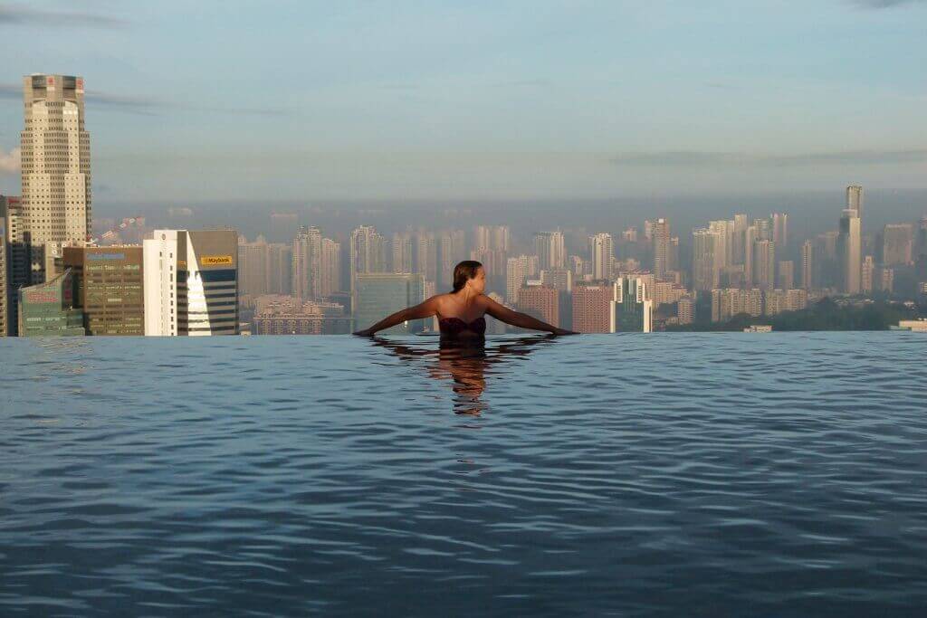So let's talk about that swimming pool, shall we? Well, yes, it is something special and I don't think I've swam in a more memorable pool but it's also fair to say that very quickly it becomes more like human soup than a swimming pool. We had heard the best way to get a good photo with nobody else in it, not to mention the best light, was to go up when it first opened at sunrise. We did this and it was 100% worth it. When we went up to the pool at any other time it was just too busy, and it was also a bit odd having crowds of people watching you in the water or lying on a lounger on the poolside, because non-hotel guests are permitted to go up to a viewing gallery or to the bar-restaurant found at the top (although you still have to pay!).