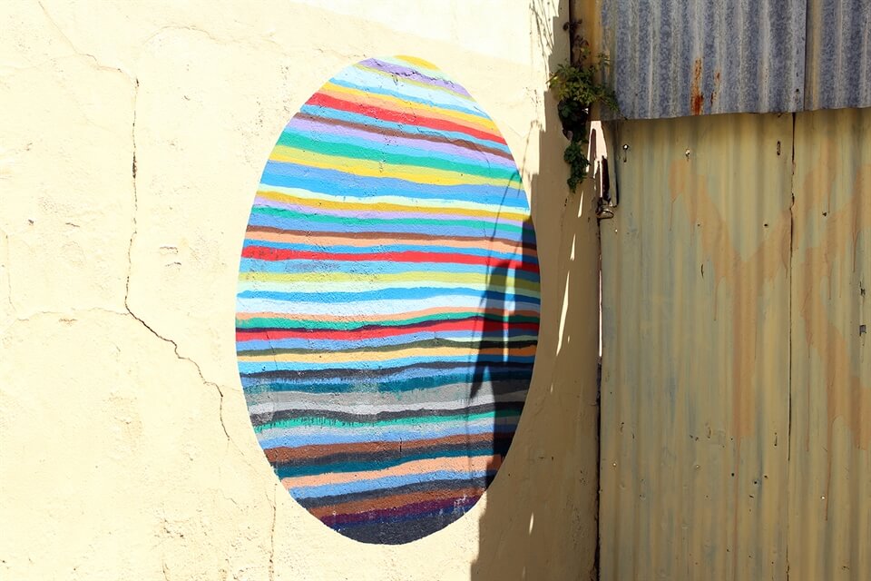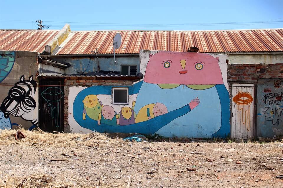 Artists may have arrived from their various corners of the world - Israel, UK, France, Australia, Spain, China among many others - with pre-conceived ideas of what they were going to create, but most were influenced not only by South Africa's people as a whole but also by the individual residents who permitted them to use their walls, their homes as a canvas. On the wall of a porch of one house were the happy faces of two young boys with dark eyes and small smiles - "They're the children who live in that house," Juma told me - and on another wall among a dream-like mural of words and shapes was the face of a young woman looking down at the ground beneath the house.