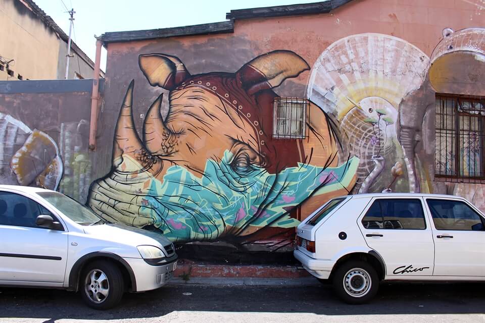 The art began almost immediately, around the corner of the Woodstock Exchange. A number of the first murals I saw were about a number of the endangered species of animal currently under threat in South Africa. Londoner Louis Masai's Blue Crane, Giraffe and Save the Rhino banner were instantly recognisable and immediately thought-provoking and Ukranian artist Interesni Kazki's “Zebra Suit” seemed to have more messages the longer you looked at it.